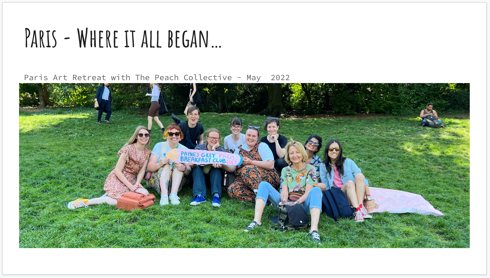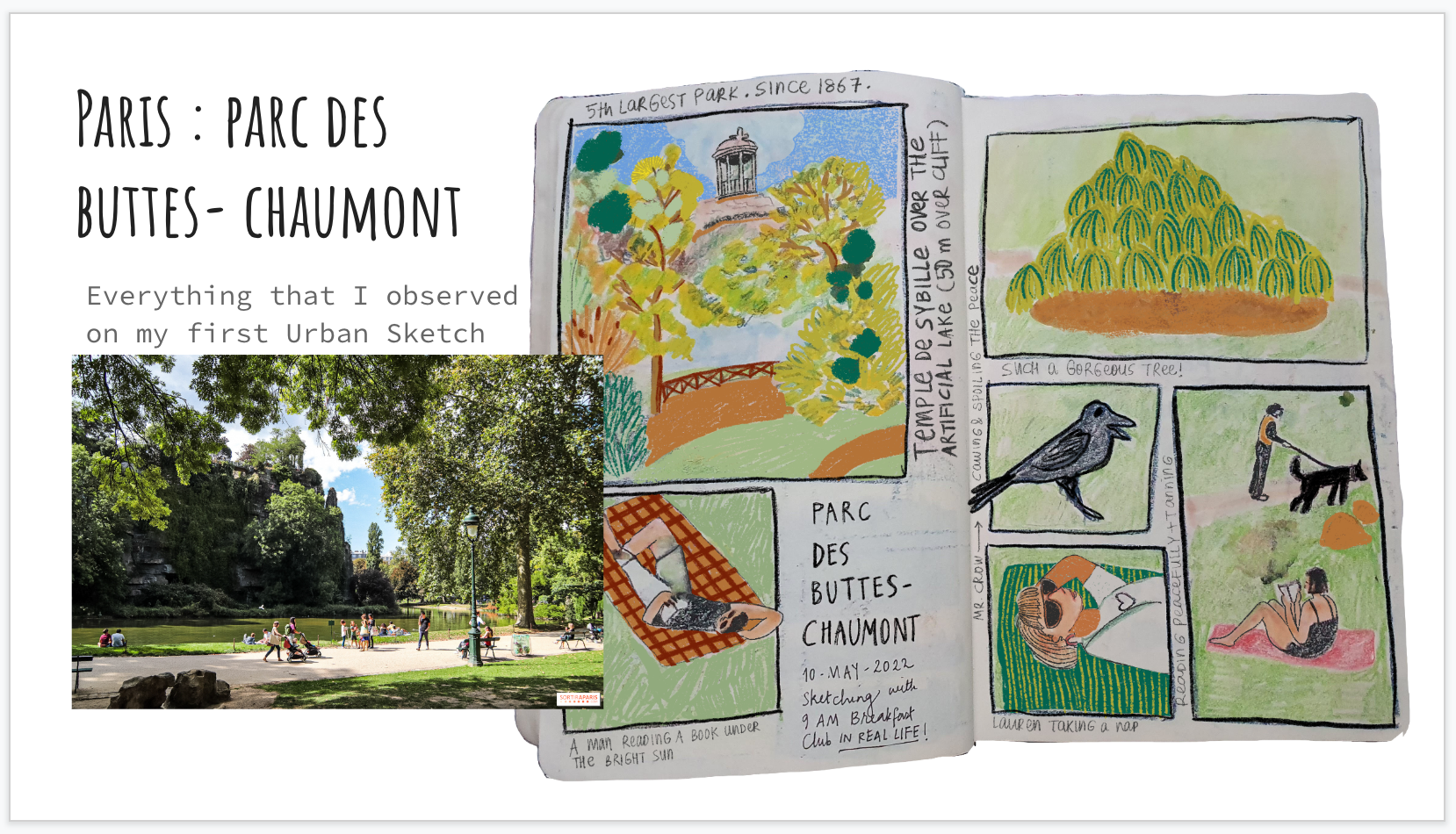 So, pictured here is my lovely illustration group, my comfort zone, we have been drawing online together since the pandemic. However, In May 2022, this changed! We decided to organize an art retreat in Paris, and meet each other in real life, and start drawing on location live. Initially it was not so easy, I would freeze every time somebody stopped to look at my sketchbook or ask questions…but being with this group really helped to get confidence and to develop the habit of going outdoors with a sketchbook.