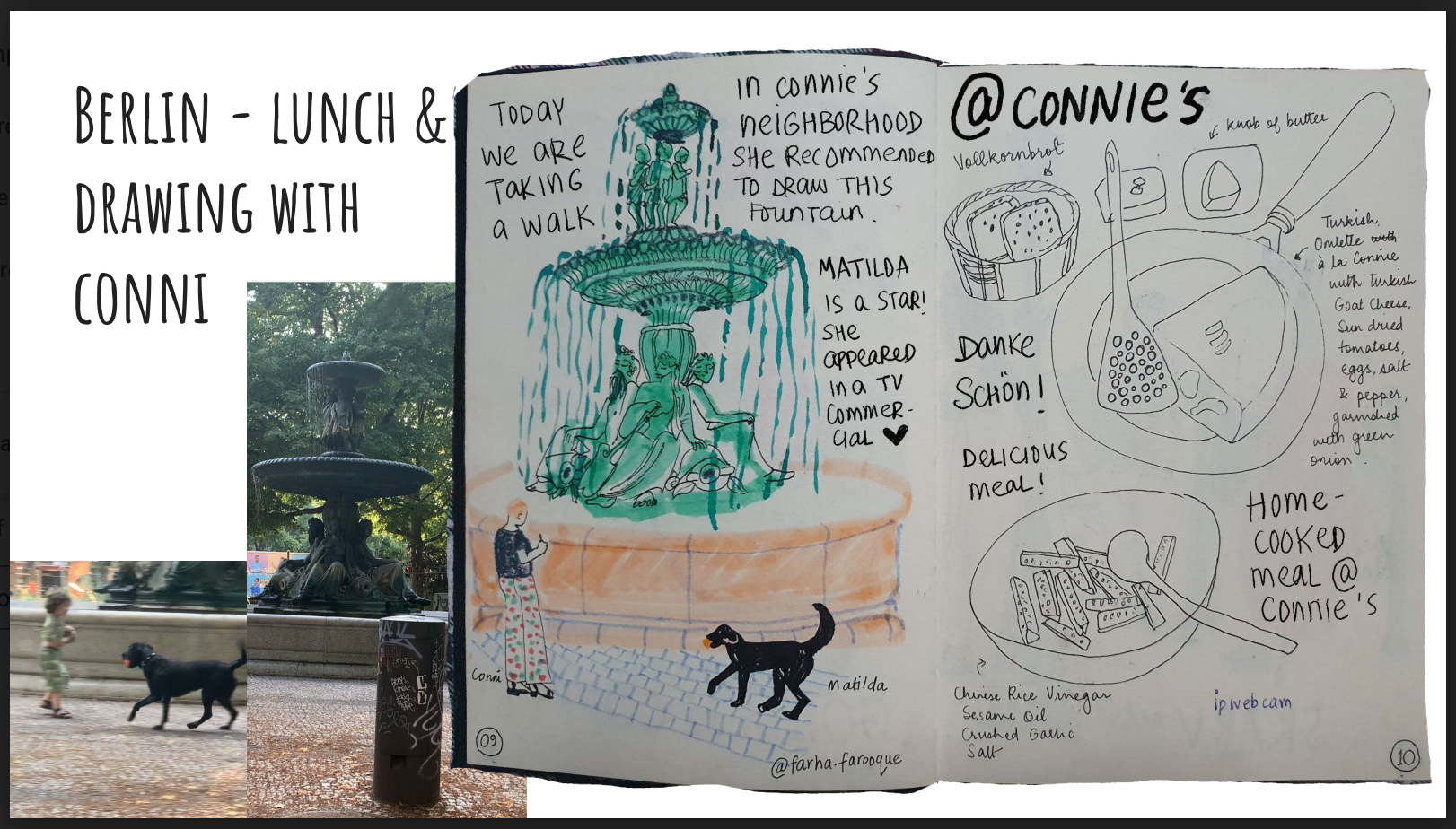 So with the Berlin Urban Sketchers, I met Connie, who is a sketch-noter, who invited me to a home-cooked meal, we then went sketching in her neighbourhood and drew this fountain, you can also see a very playful dog who kept dipping in and out of the fountain water. I would learn that her name is Mathilde and she is a celebrity dog who features in a TV commercial.