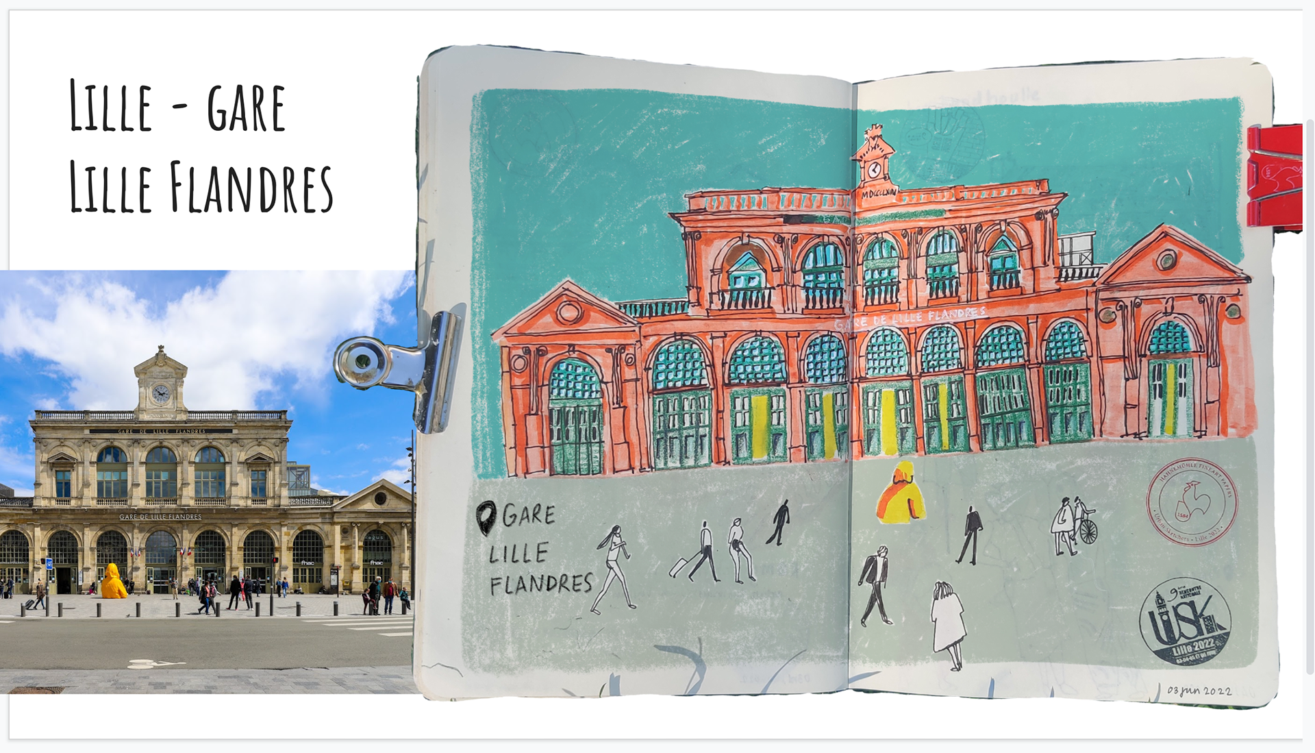 Now that it's time to leave Lille, we are back at the Main Railway Station, there is a very sweet sculpture of German-French Actress Romy Schneider, It was amusing that people use her arms as a seat, while they're waiting for a train or for a friend. Also featured is a cute little house that I had to stop and draw before the train leaves. Let's go!