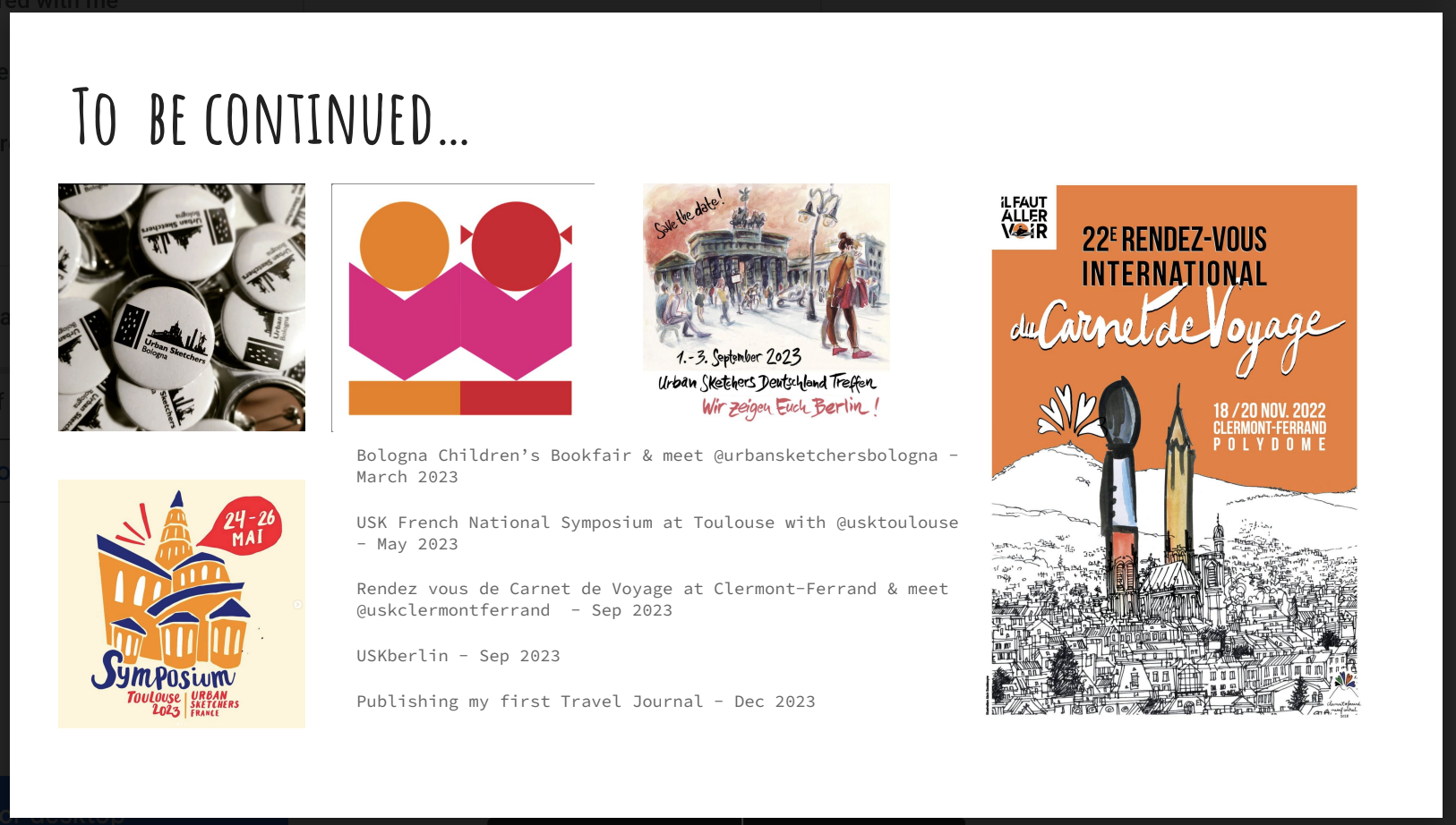 In March we have the Bologna Children's Book Fair, it would be a good opportunity to meet the Bologna Urban Sketchers too. Then the French National Symposium in Toulouse, The Travel Journal Fest in Clermont Ferrand in September, USK Berlin in September. I hope to see any of you in these events, because we are all connected, and I'd love for you to be a part of my story. Thank you.