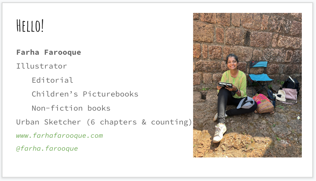 I’ve added my website (you're already here, reading this transcript!) & instagram handle (@farha.farooque), where I share a lot of snippets my art process, travel drawings on the go, so you can check that out if you like!