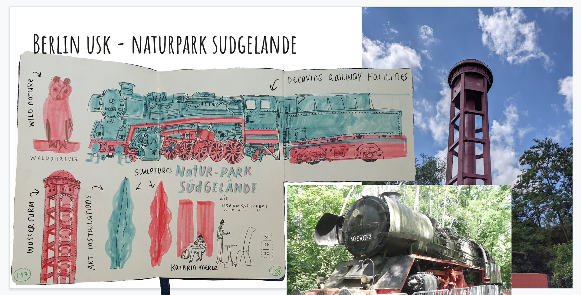 So at some point I do reach Berlin, where I was happy to join Berlin Urbansketchers for a sketch-meet at Natur Park Sudgeland - this park is unique in the sense that it is a mix of technology (decaying railway facilities), art installations and wild nature, which is amazing because it is originally a former Railway Yard