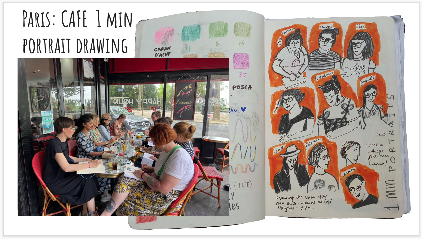 For a week, we challenged each other to various drawing exercises outdoors - drawing in parks, restaurants, cafes. Here we are all taking a coffee together at Cafe Olympe outside of Parc des Buttes-Chaumont (very dehydrated & in the case of Geraldine hangry soon...) and instead of focussing on our beverages we instead began to drawing quick 1 minute portraits of each other! The Cafe owners were so happy to welcome us, exchanged wonderful conversations and and took photographs of us!