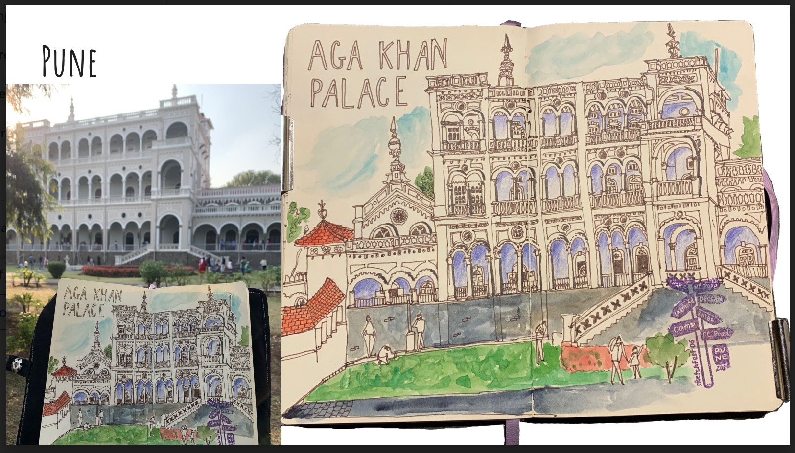 I went to draw the Aga Khan Palace with its magnificent structure, twice, once with family and once with drawing friends